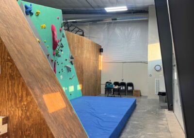 The climbing gym occupies three bays of a four‑bay strip configuration, with the project delivered through a design‑build approach. Early collaboration was essential due to the tall open volumes, irregular wall geometries, and safety clearances that had to remain unobstructed by ductwork, conduit, and equipment. Climbing walls and anchor points limited overhead routing pathways, making early spatial planning critical.